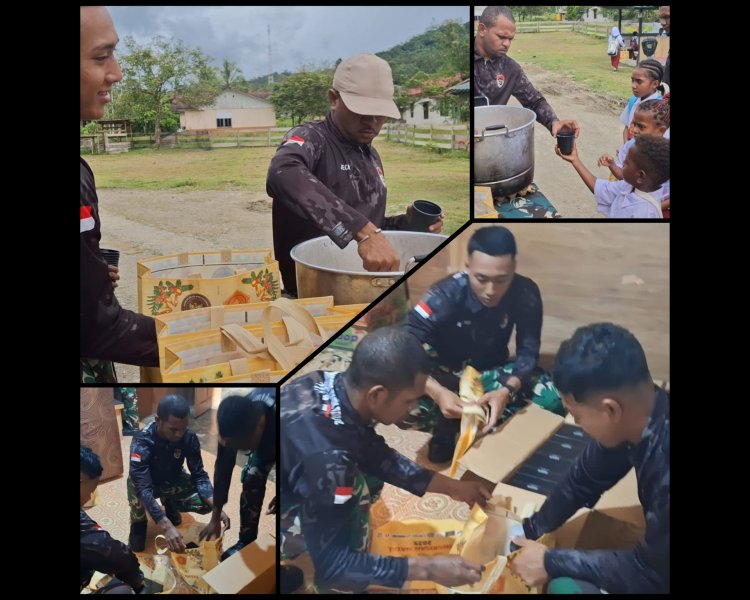 Dalam kegiatan tersebut, para prajurit TNI membagikan kacang hijau dan biskuit kepada anak-anak sebagai bentuk perhatian terhadap pemenuhan gizi sekaligus upaya menghadirkan kebahagiaan sederhana di tengah kehidupan masyarakat perbatasan. Bantuan yang diberikan tidak hanya bernilai materi, tetapi juga mencerminkan kepedulian dan kasih sayang prajurit kepada generasi penerus bangsa yang tumbuh di daerah terpencil.
